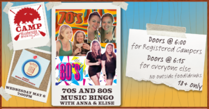 Join us for 70s and 80s Music Bingo w/Anna & Elise on Wednesday May 6 in the Great Hall! Camp Woodwright is themed to the summer camps of the 70s and 80s, so we figured what better theme for this month’s Music Bingo??
